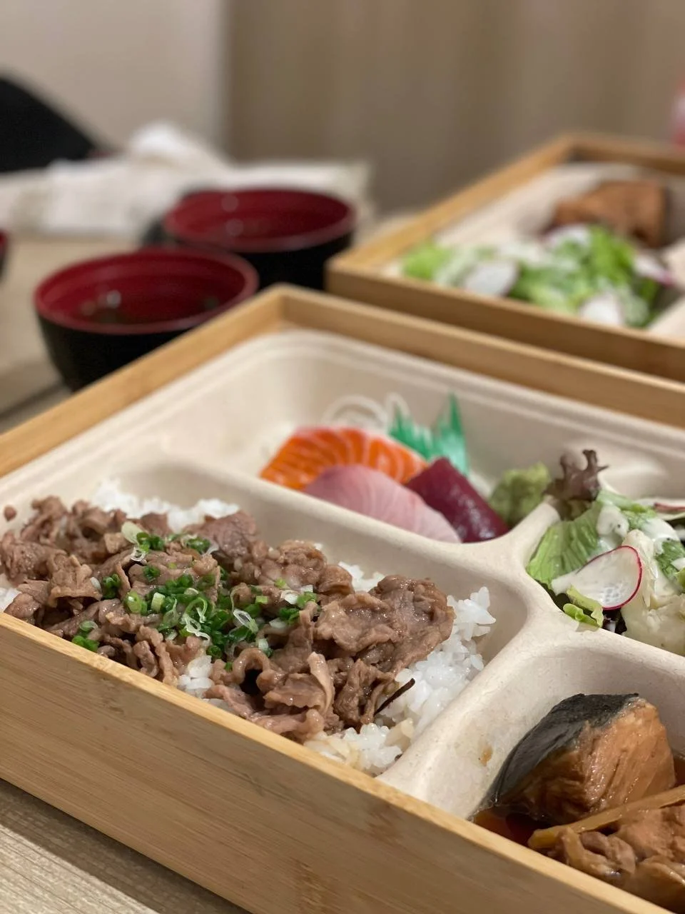 I was pleasantly surprised at the quality of the bento! Not only was the sushi tender and fresh, they were really generous with their portions! Both of our bentos came with a side of Miso soup, a small portion of salad, braised salmon, and thick Sashimi slices. The Yakiniku beef was tender and flavourful, and each bento set comes with free flow green tea with the option of having it hot or cold!
