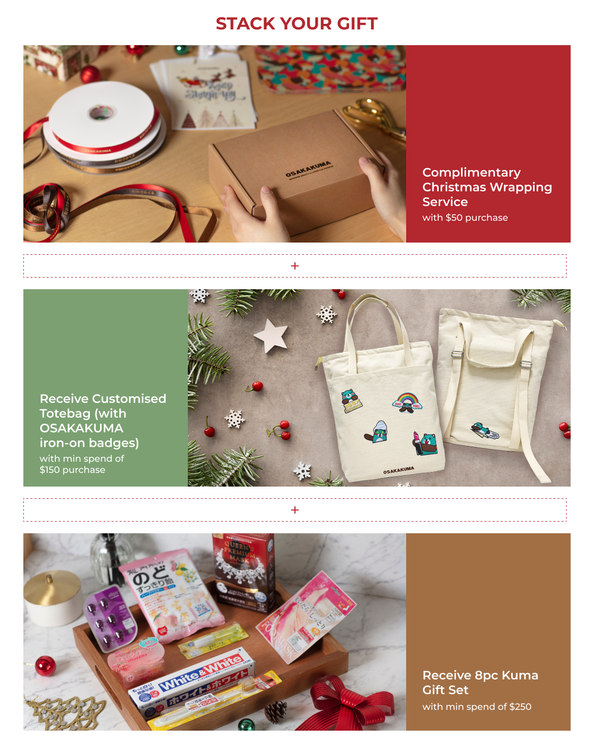 With a $50 purchase, a complimentary Christmas wrapping service with a physical Christmas gift card will be offered! With minimum spending of $150, you will also receive a customized tote bag. Aside from that, you will also receive all of the above and an Osakakuma Bag with 8 pieces of Gift when you spend $250 or more!