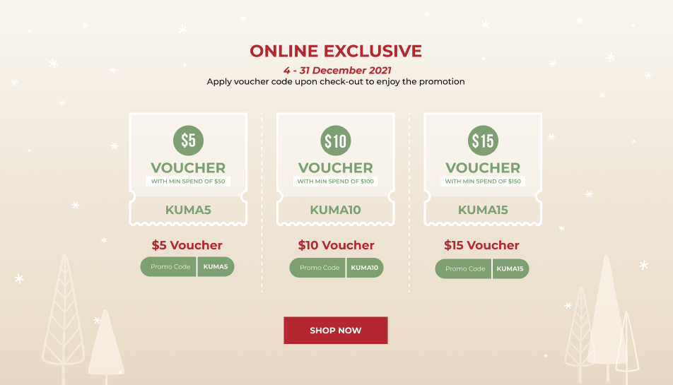 Enjoy a $5 Voucher with min. spending of $50 when you check out from the Osakakuma online store with the code “KUMA5”, a $10 Voucher with min. spending of $100 with the code “KUMA10”, and a $15 Voucher with min. spending of $150 with the code “KUMA15”!