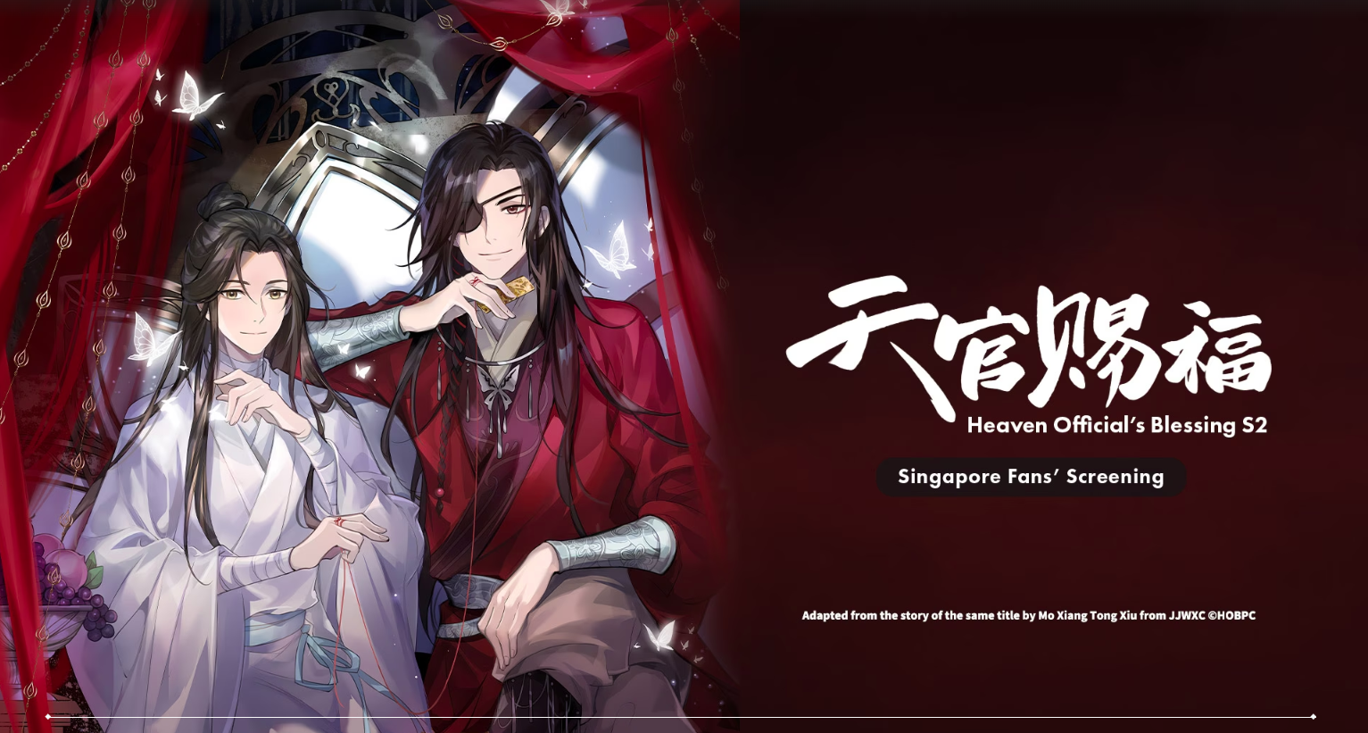 Season 2 covers the Ghost city arc where Xie Lian travels to Hua Cheng’s home. Will all truths be exposed or will Hua Cheng continue to keep the truth hidden? Come find out as "Heaven Official's Blessing" Season 2 comes to Singapore to show off its premiere!