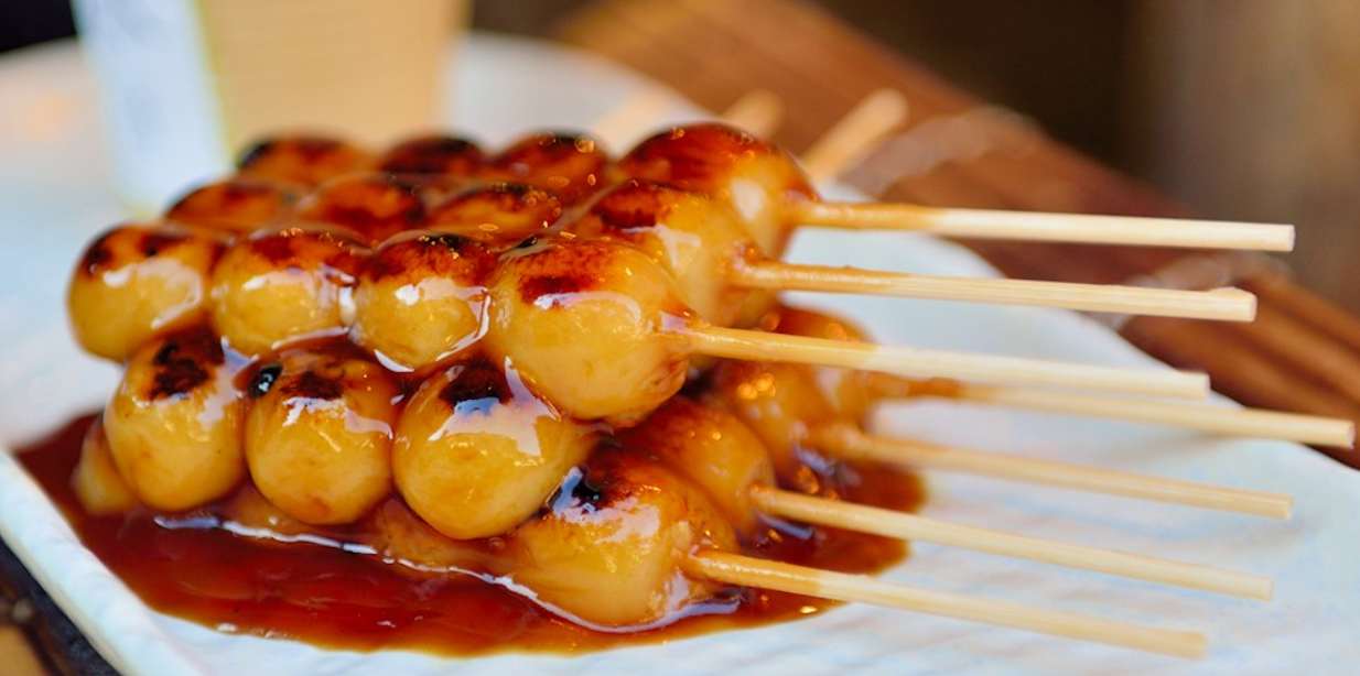 Mitarashi Dango are round rice dumplings smothered in a gooey sweet soy glaze and skewered onto bamboo sticks in groups of 3-5. This dessert allegedly got its name, Mitarashi, a festival of a famous shrine in the city of Kyoto in western Japan. Mitarashi Dango was thought to be made as an offering for gods at this shrine in the 14th century. Since then, this dessert has been sold at street vendors in shrines in Kyoto and eventually all over Japan. Today, one can easily find it at Japanese sweet shops and at supermarkets and convenience stores.