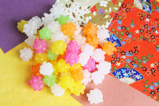 Konpeito are small colored candies made of pure sugar, water and food flavouring and shaped like confetti stars. They come in varieties of colours and flavours. It is often described as kawaii (cute) due to its unique look and bright colors.