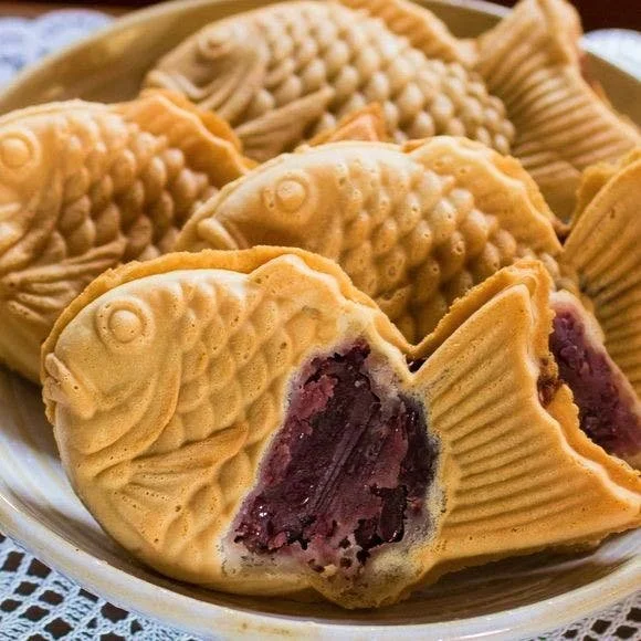 Taiyaki is a classic Japanese street vendor snack in Japan which is a cross between cake and waffles that is fish-shaped. It is commonly filled with red bean paste that is made from sweetened azuki beans. Other common fillings include custard, chocolate, cheese, or sweet potato. This dessert originated from sometime during the Edo period (Tokyo) where marketing-savvy shops started shaping an old dessert, imagawayaki, in the shape of a tai—a type of fish known as Japanese sea bream. The unique design sold better and became the wildly popular taiyaki as we know now.