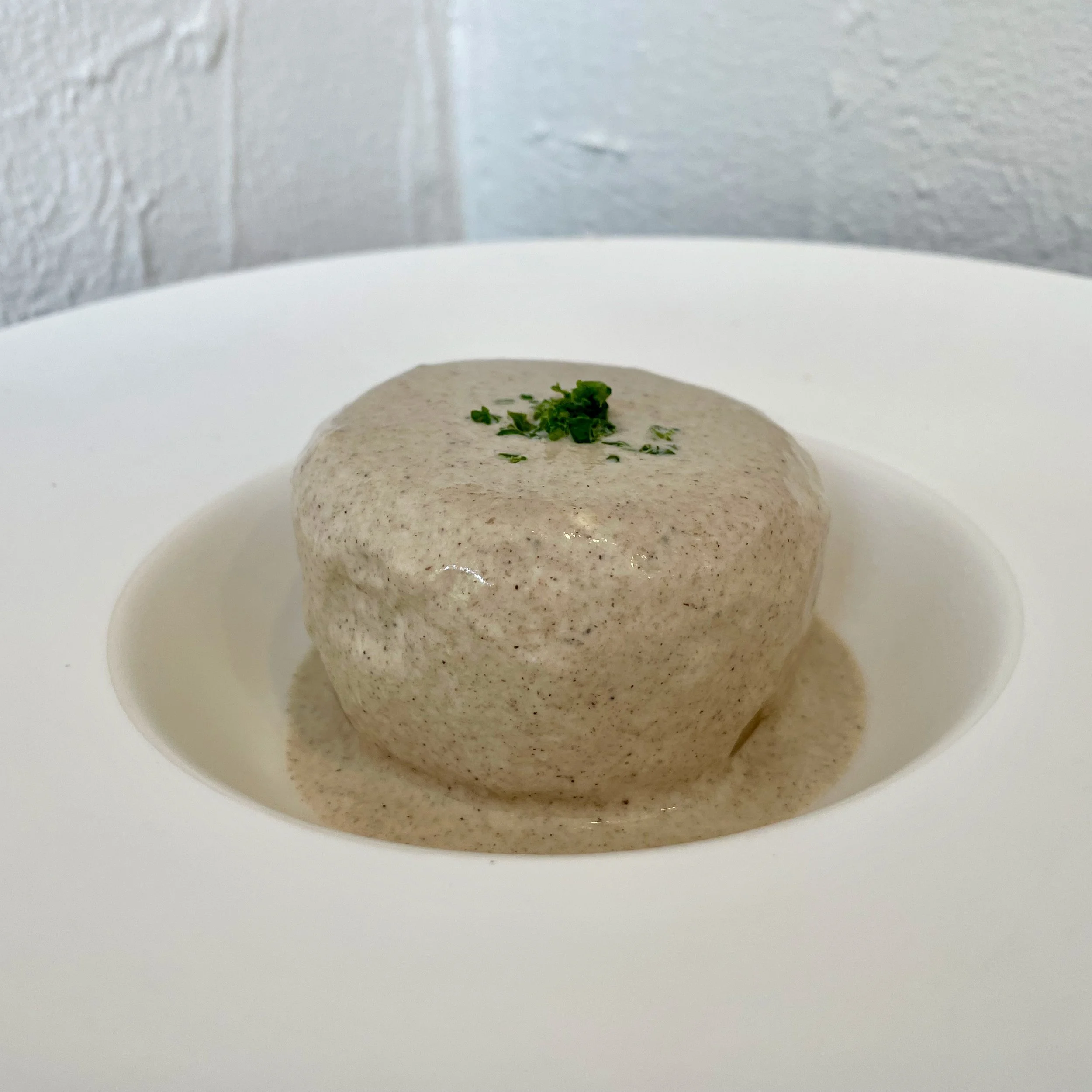 A generous serving of porcini mushroom sauce is poured over a piece of thick and tender daikon. This is a wonderful fusion style which elevates the humble daikon with earthy mushroom tones.
