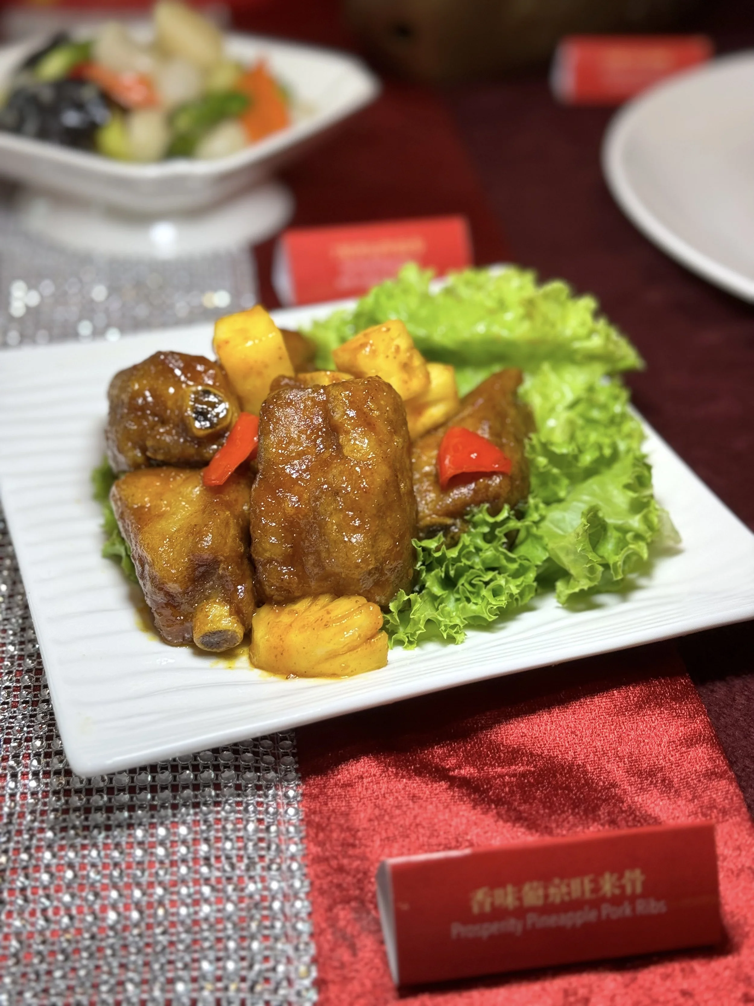 Delight in the tender Prosperity Pineapple Pork Ribs, seared to a sweet caramelised perfection alongside pineapple cubes, all enhanced by a delightful sweet and tangy sauce.