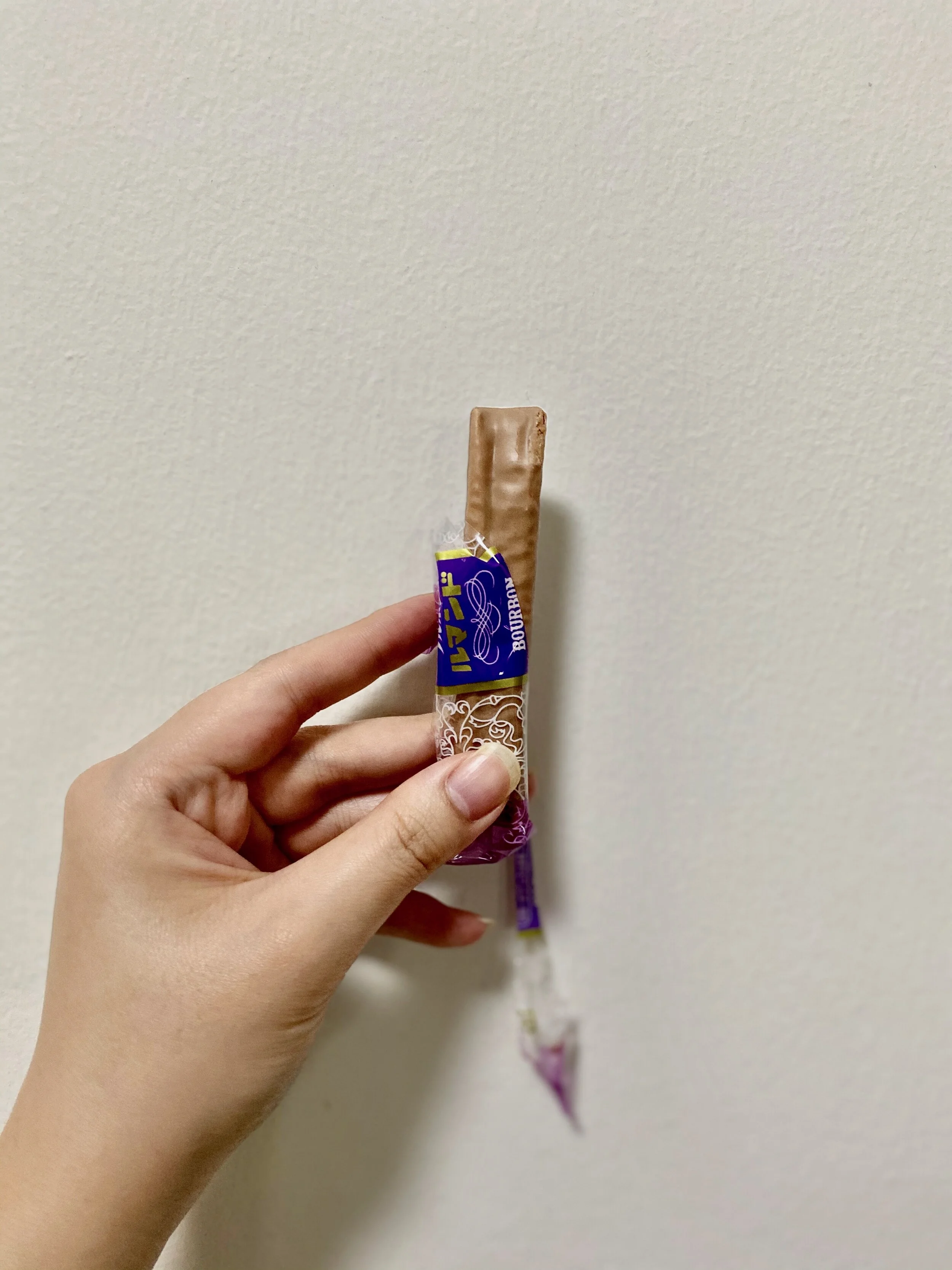 The appearance of this biscuit can seem very unappealing, but it will definitely surprise you as it did for me. Of light and crispy texture, the mild cocoa cream coated on the outside further complimented the whole taste.