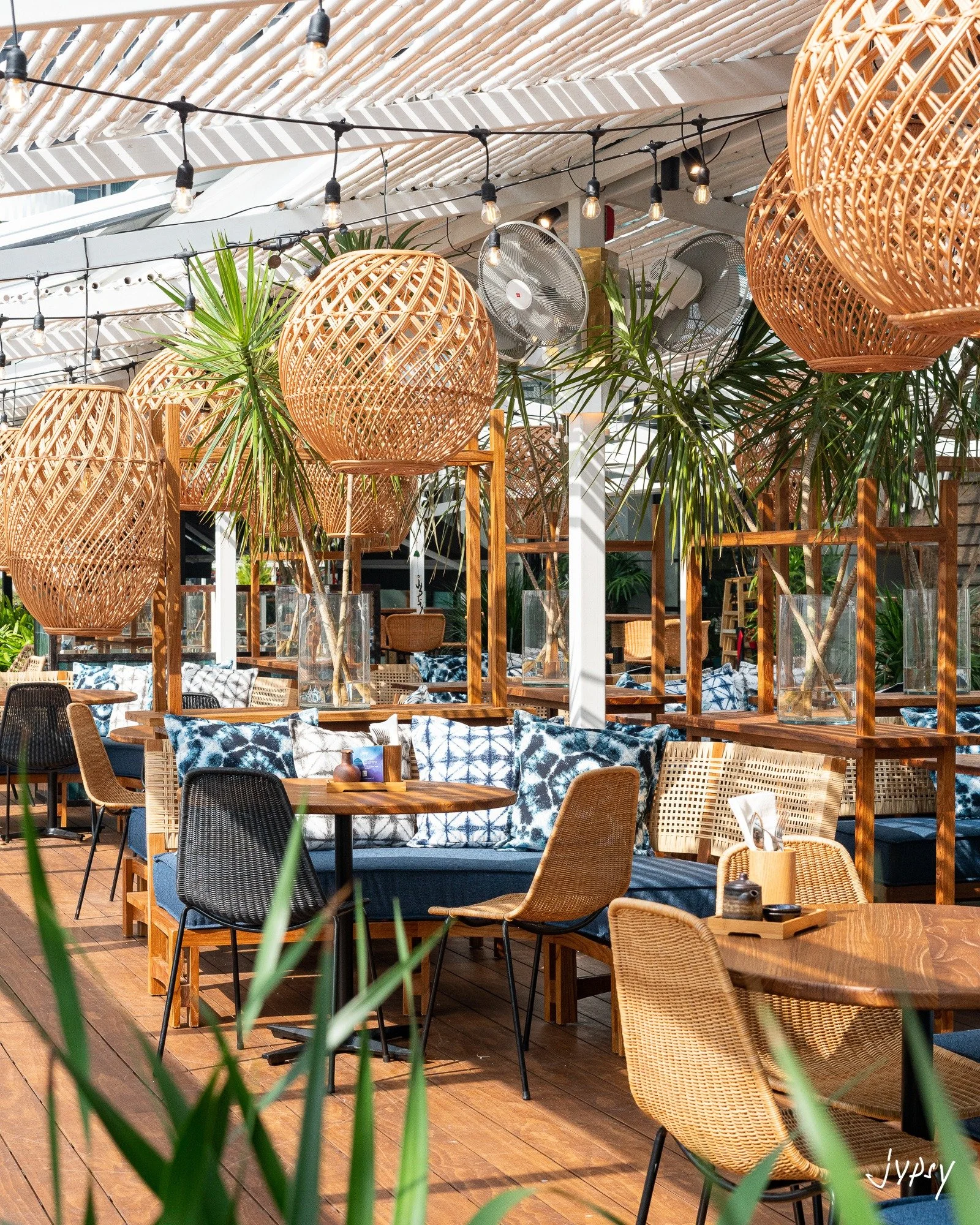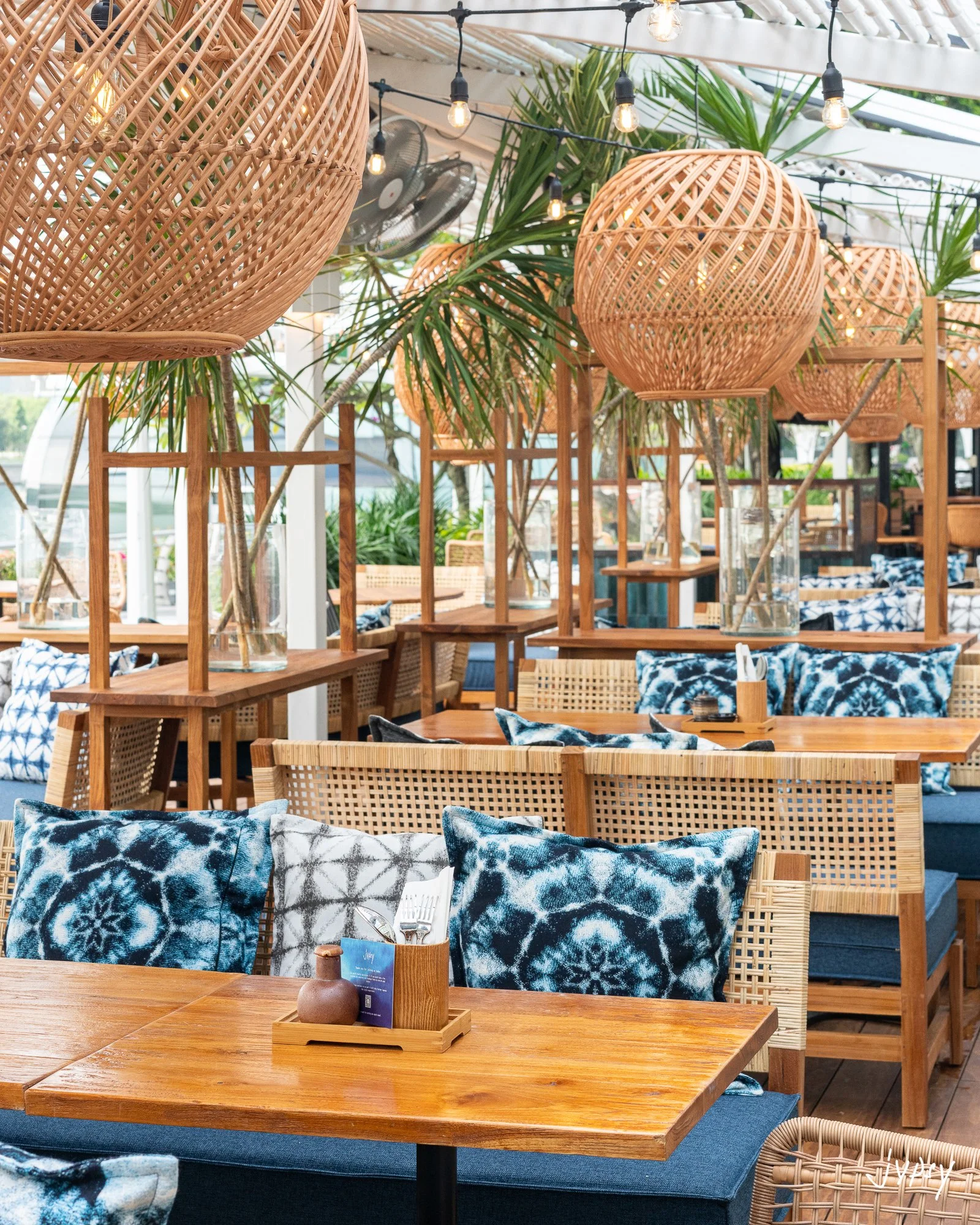 This new bohemian coastal-inspired space is decked with wooden furniture- from rattan dining chairs to Japanese-inspired hanging lanterns, and hand-stained fabrics, offering a cosy and casual ambience.