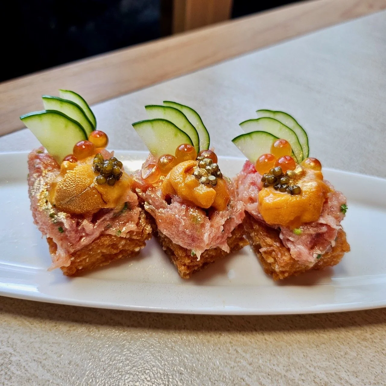 Exclusive to Ginkyō are an assortment of bite-sized Ginkyō Crispies with decadent toppings. Uni, Caviar, Ikura Crispies ($22) presents a medley of Japanese seafood delights such as negitoro, uni and ikura, finished with caviar and edible gold flakes.