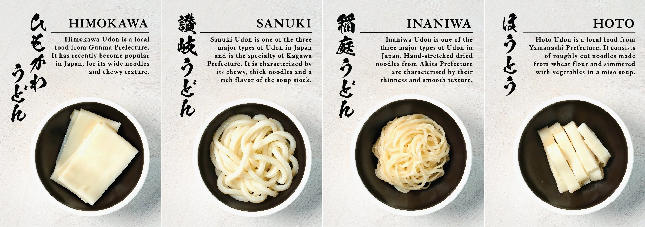 While we are generally familiar with udon as a type of thick wheat flour noodle, the texture and characteristics of udon vary from region to region in Japan. Himokawa udon is extremely wide and flat and is very smooth and slippery, with a chewy consistency. More commonly seen in the local food scene, Sanuki udon is thick and chewy with a firm texture.