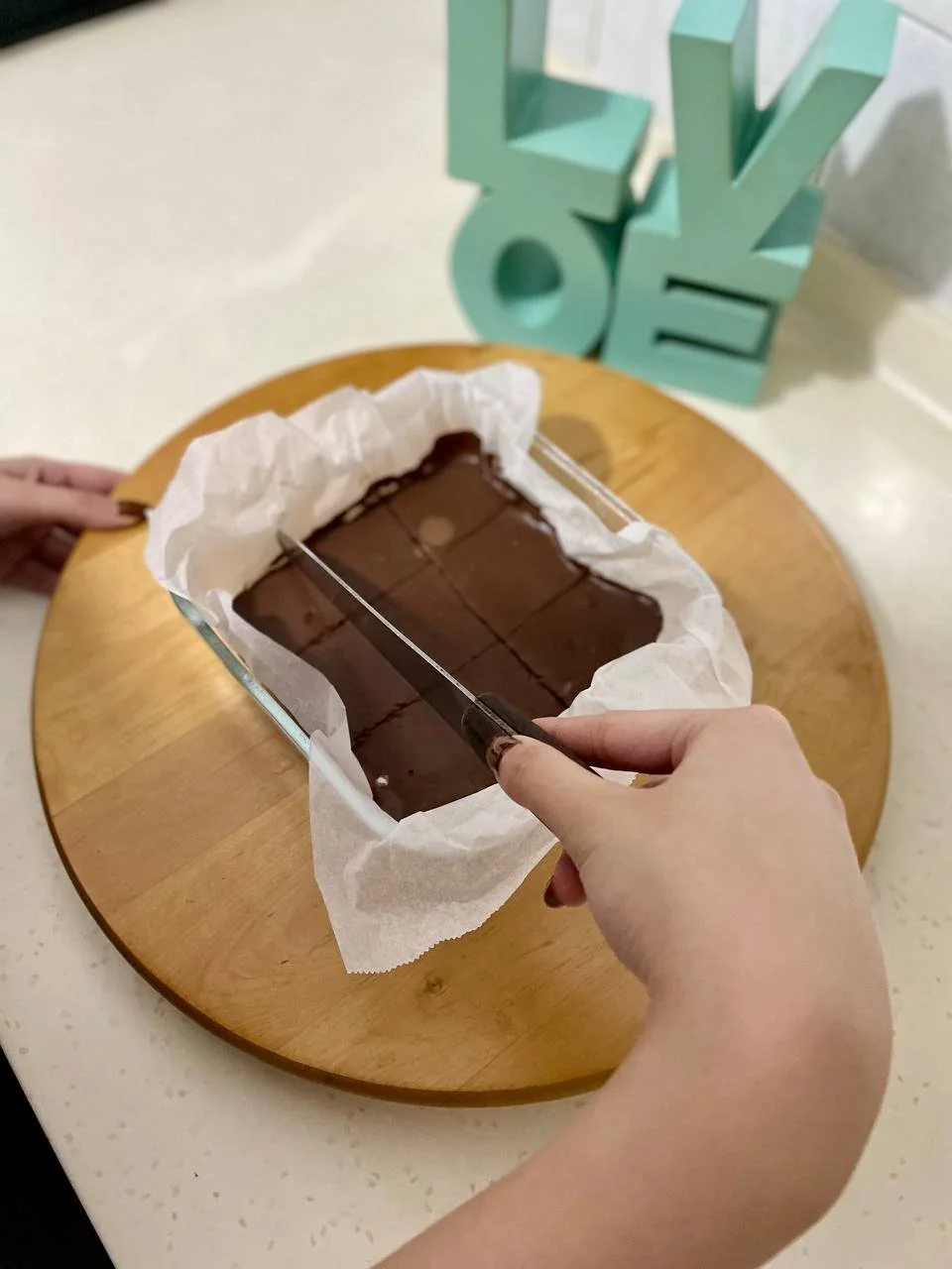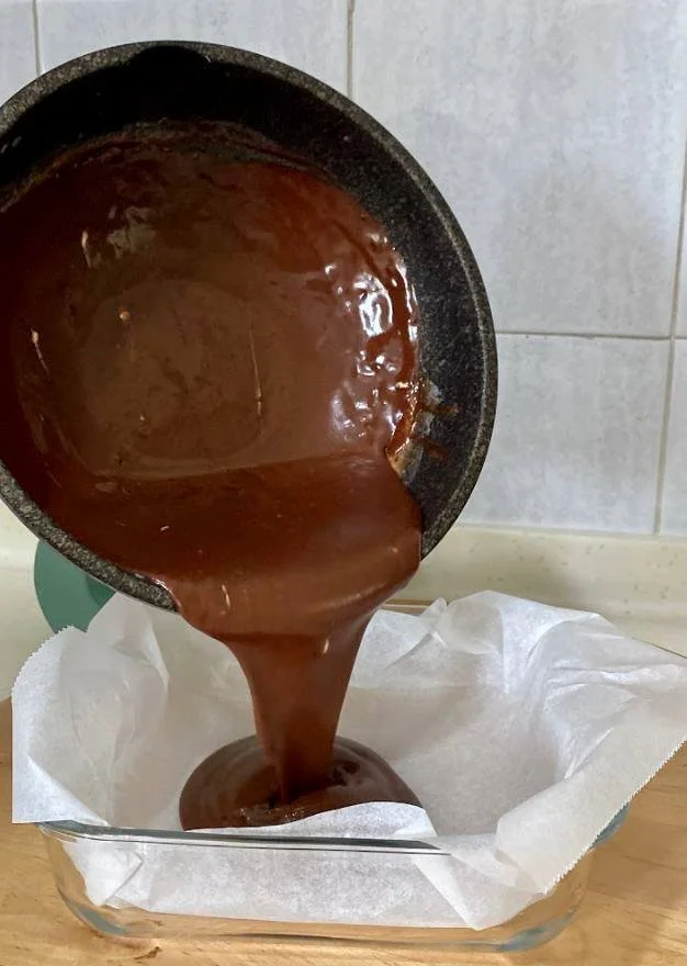 Pour your ganache into a lined square pan, and set aside in the freezer for 4-5 hours!