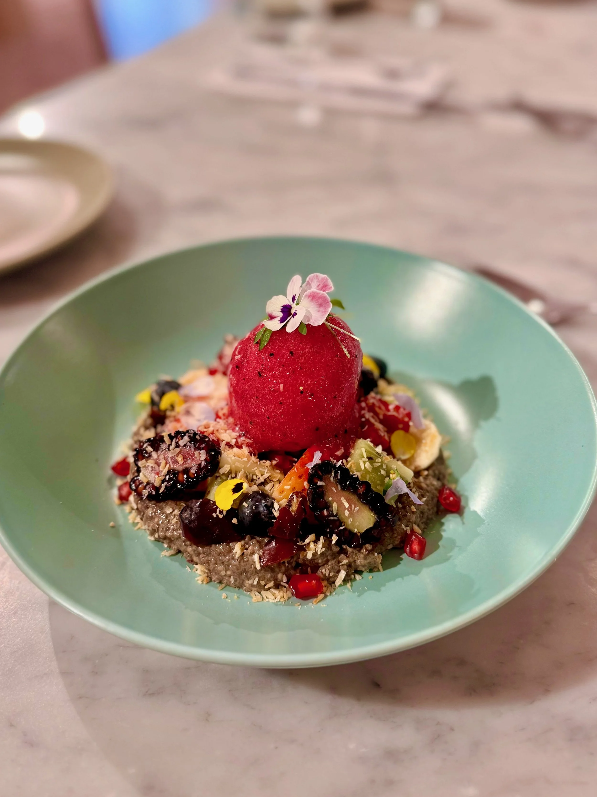 A refreshing all-day option is the Chia Seed Pudding ($17), creamy and chewy chia seed pudding topped with dragonfruit sorbet, toasted coconut flakes and fresh fruits.