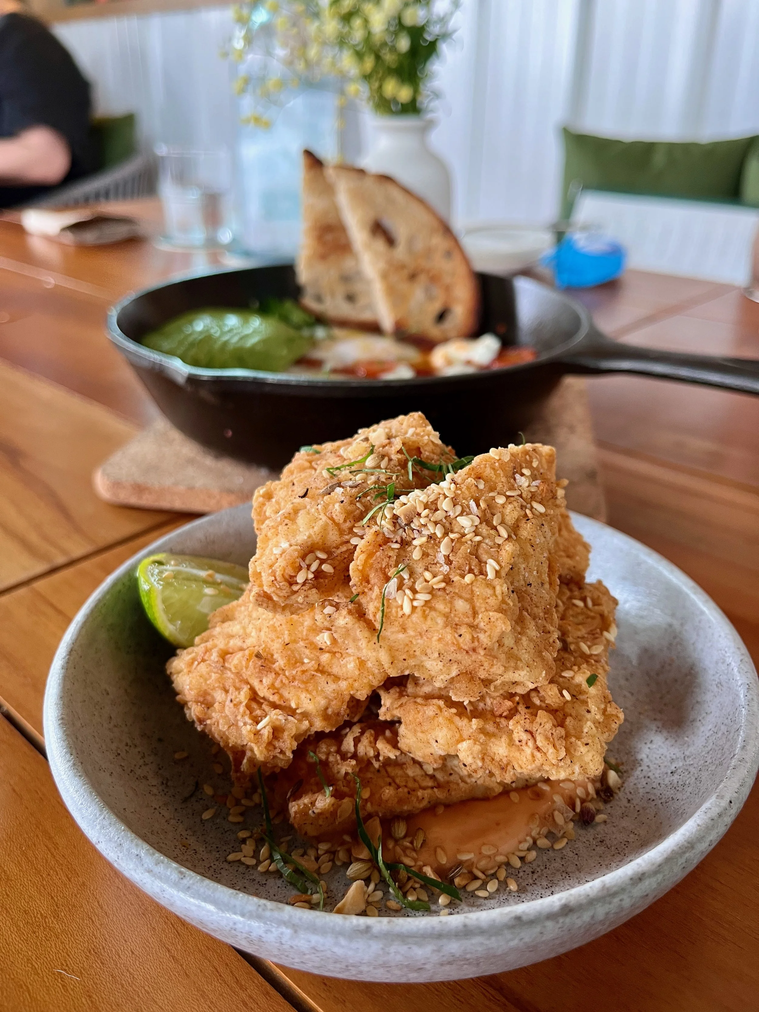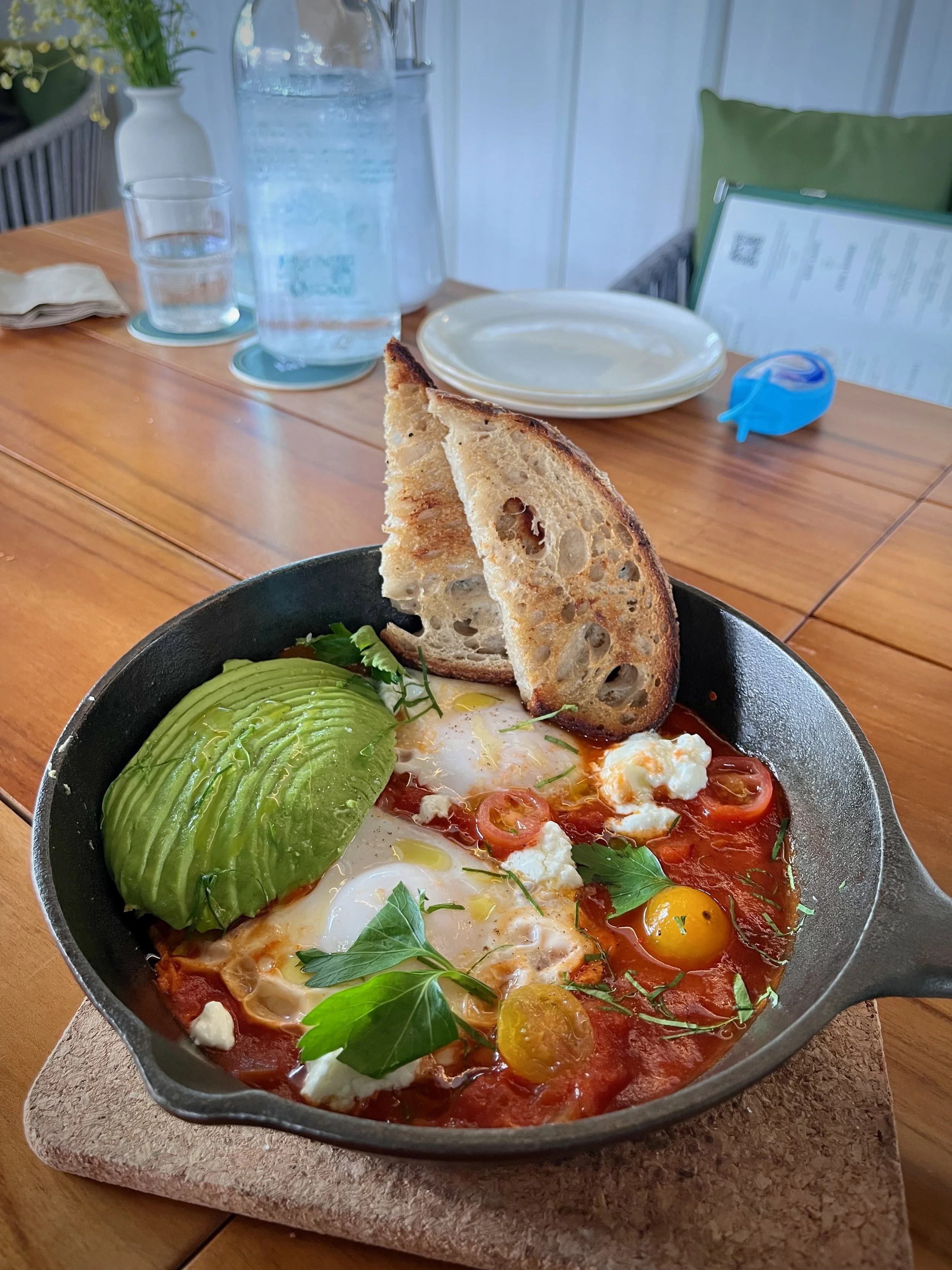 A selection of brunch dishes is available until 2pm, while grilled specialties and other mains are available from 12pm onwards. Our starter was this hearty brunch dish- Shakshuka $20, made with coddled eggs in a simmering mixture of heirloom tomatoes and avocado topped with feta cheese. The velvety texture reminded us of perfectly executed poached eggs with extra healthy toppings. We also enjoyed the toasted sourdough slices.