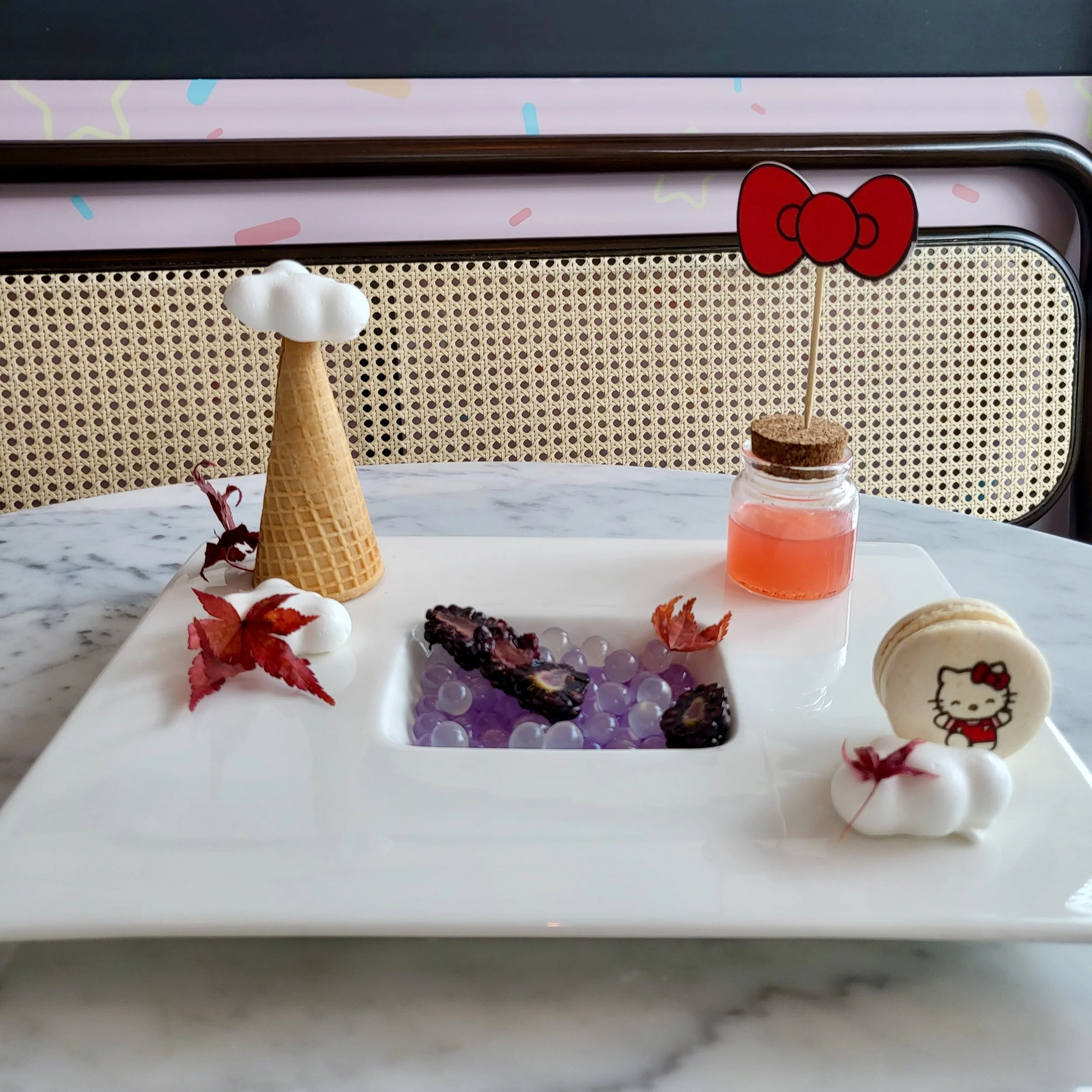 Enjoy a specially curated menu suitable for all ages, dotted with adorable accents of Hello Kitty and Little Twin Stars, complete with a picturesque dining experience under cotton candy pink awnings.