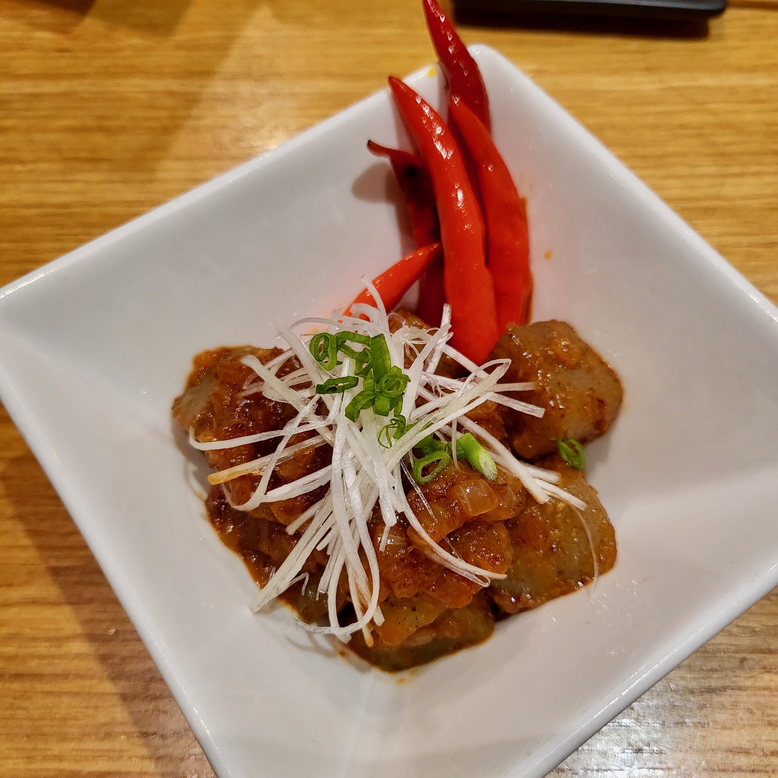 Fans of spice and mala should try this bite-sized konnyaku jelly braised in an oil-free dashi stock, seasoned with shichimi toragashi seven-spice chilli. We enjoyed the gummy texture of konnyaku jelly served with extra heat and spice!