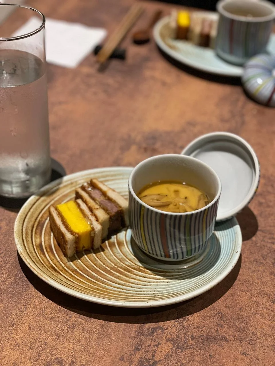 Next, we had the soft and silky Chawanmushi- drizzled with savoury Dashi and packed with mushrooms and lotus root. Served alongside are 2 bite-sized Katsu Sando. The bread was so crispy, which goes well with the deep-fried tamago and tender pork katsu. It also comes with a spread of wasabi mayo which elevates the taste of this dish!
