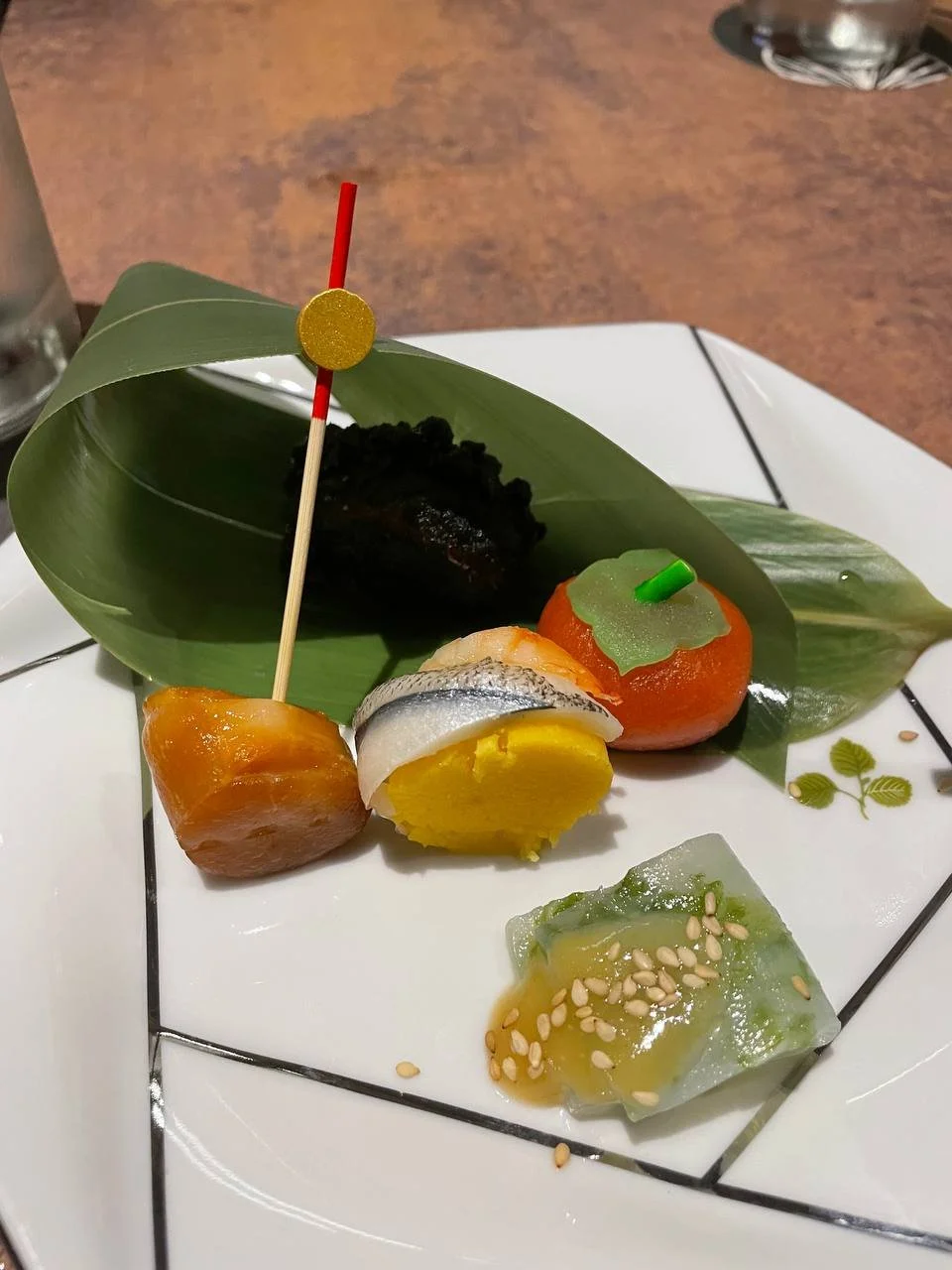 Then, we were served appetisers, Zensai, which comes with seaweed Konjac grazed with a tangy miso mustard sauce, Tazuna Sushi with pounded vinegared tamago roll topped with seasonal fish, smokey and tender Scallop, crispy charcoal-battered chicken Karage, and a cute persimmon-shaped Mochi, stuffed with sweet red bean filling.