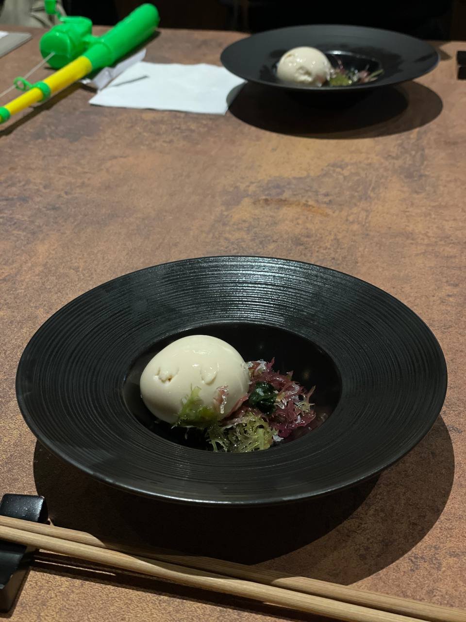 We tried the 7-course Omakase lunch and begin the dining experience with a game of yoyo tsuri – a game commonly played at festivals where water balloons are fished out from a tub of water using a hook and a string. We hook up a balloon and then pop it over a bowl to reveal a smooth orb of Goma Tofu, served with a zesty yuzu dressing. So refreshing!