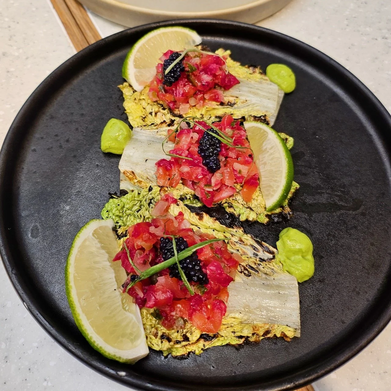 The Cured Salmon Tartare was the top favourite among us, we loved the deep and earthy profile of the New Zealand sakura salmon which was cured in beetroot juice and marinated in gin, coriander and salt.. The small small dollops of tart pickles were refreshing and added a touch of tartiness to the dish.