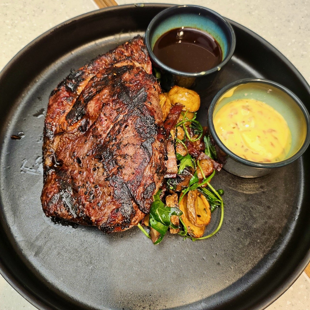 Next, we loaded up on protein with the O’connor Grass-fed Beef Ribeye, served with sautéed garlic potato & mushrooms. The ribeye was slightly dry for our liking but the béarnaise sauce & red wine sauce certainly uplifted the steak with its tangy and savoury aromatics.