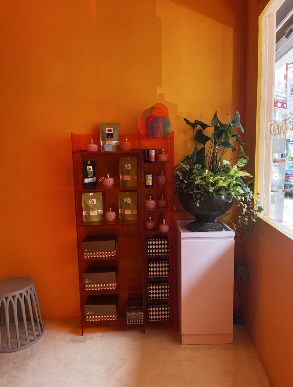 The space at the front of the restaurant is decked out in vibrant colours, with yellow-tinted windows and orange walls, and a counter displaying all the exquisite desserts and sweets.