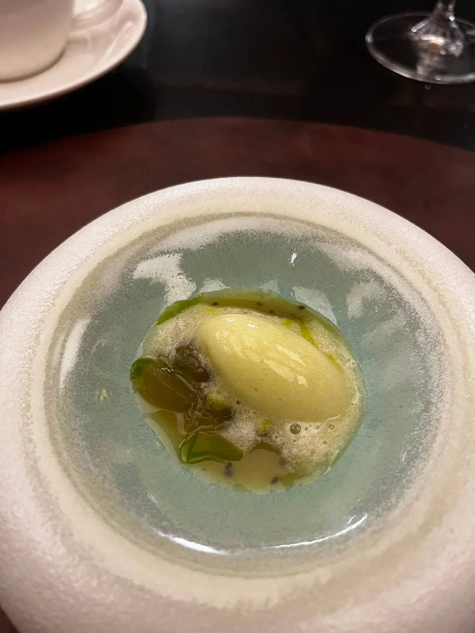 Moving down the list is the palate cleanser, Apple, served exclusively for dinner. It comes with apple and shiso sorbet, compote- made with kiwi and lime, and drops of aromatic shiso oil. It has refreshing and aromatic notes of citrus and green tea.
