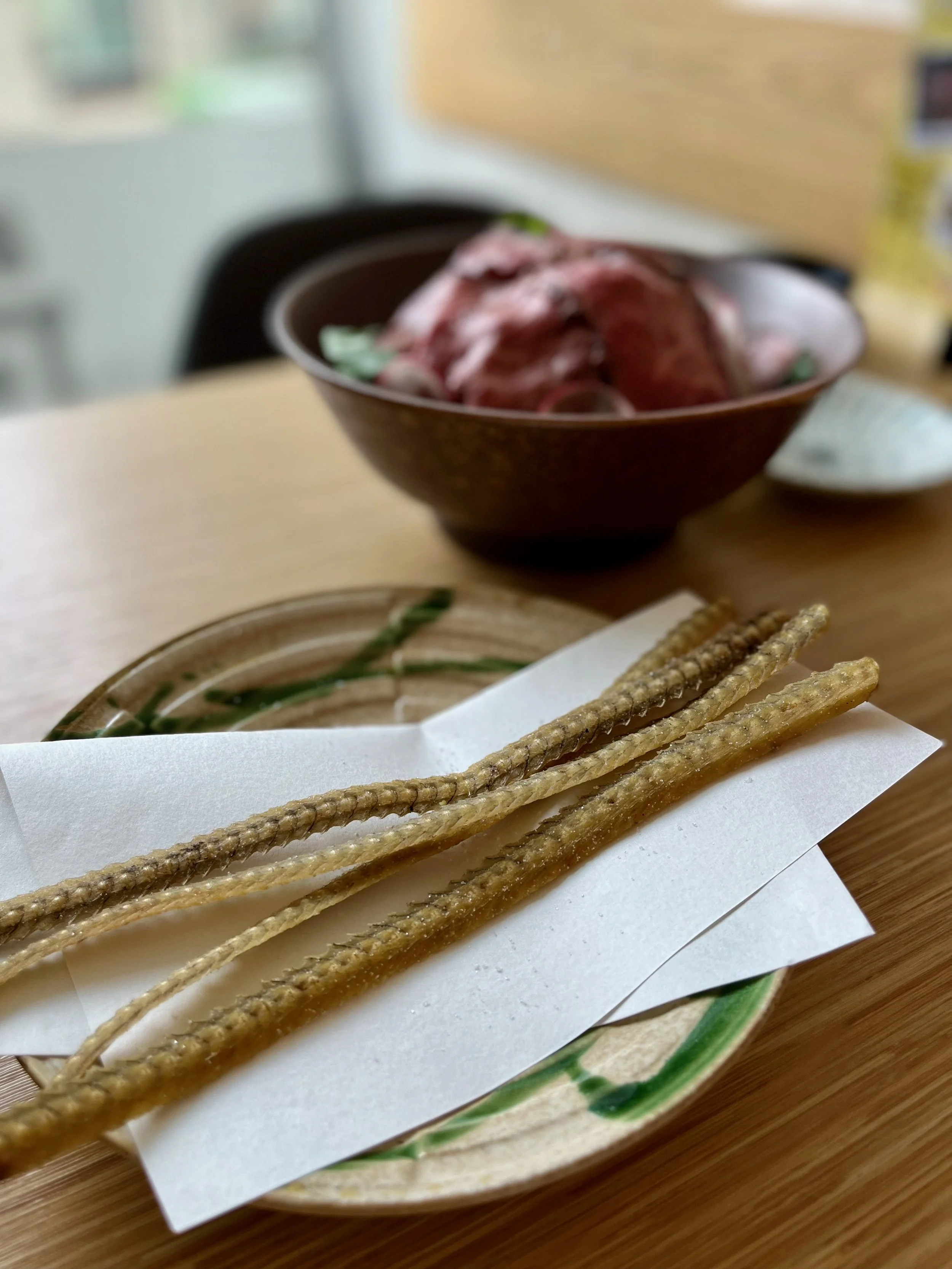 As intimidating as it may seem to some, this is actually a classic bar snack in Japan. You must be wondering if these are fish bones? Indeed, they are deep fried unagi spines, lightly salted and crunchy like crackers. They are also loaded with calcium, so you can never have too many of them.