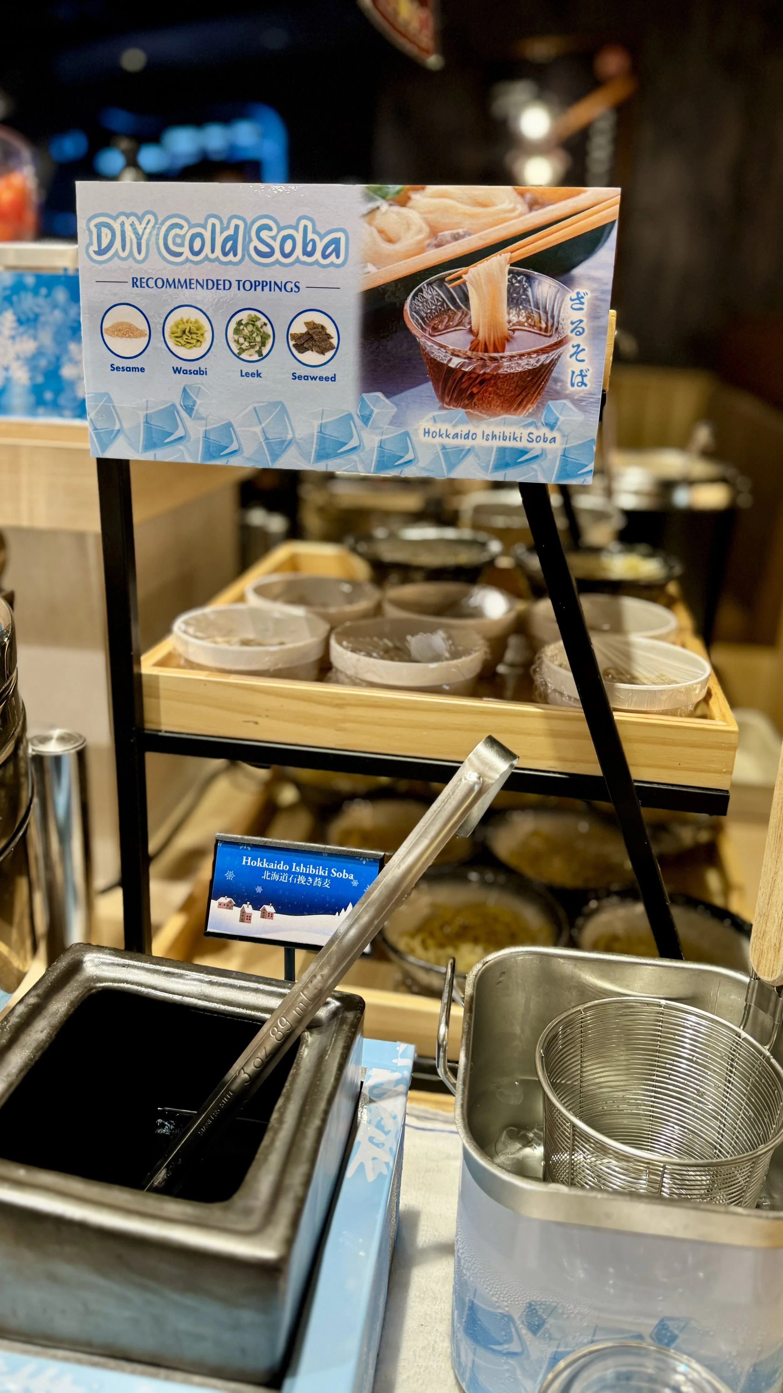 You can also create your own DIY Cold Soba at the dedicated counters! Dip the noodles in ice-cold water, then pour the broth over for the perfect chill. Top it off with essentials like sesame, wasabi, leek, and seaweed for a refreshing bowl of soba.