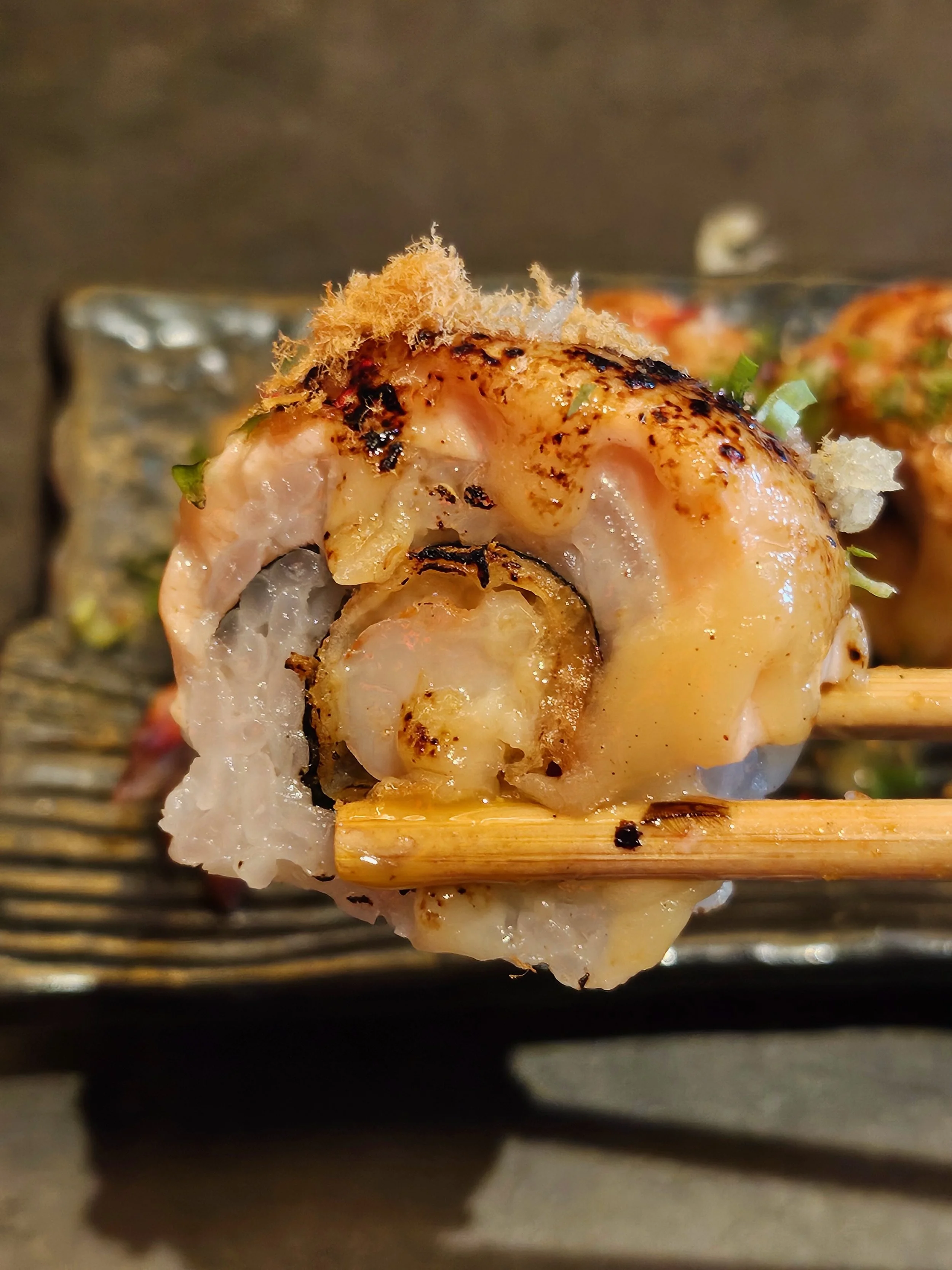 We really enjoyed the Royal Maki which is a delightful sushi roll with roll with torched salmon enveloping a deep-fried tiger prawn, brushed with chef’s signature miso sauce, and topped with a sprinkle of chicken floss.
