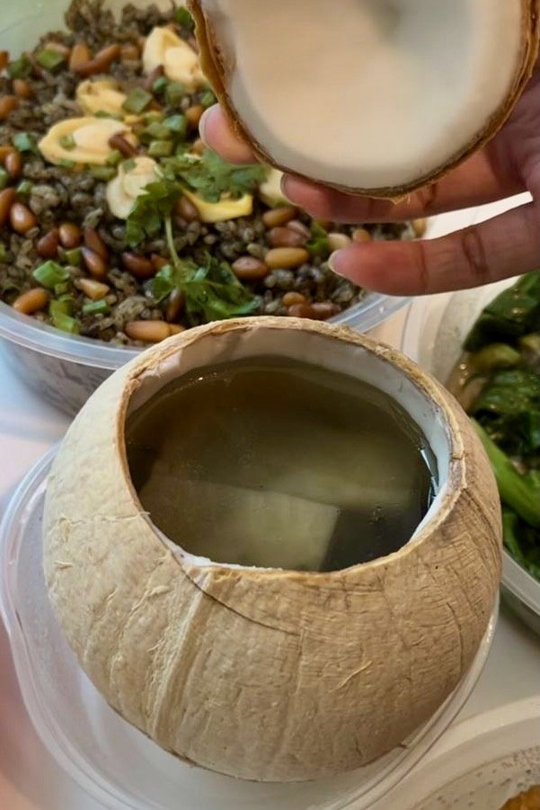 Lighter options such as Seasonal Vegetables and Double-Boiled Whole Coconut with Black Chicken Soup are also available.