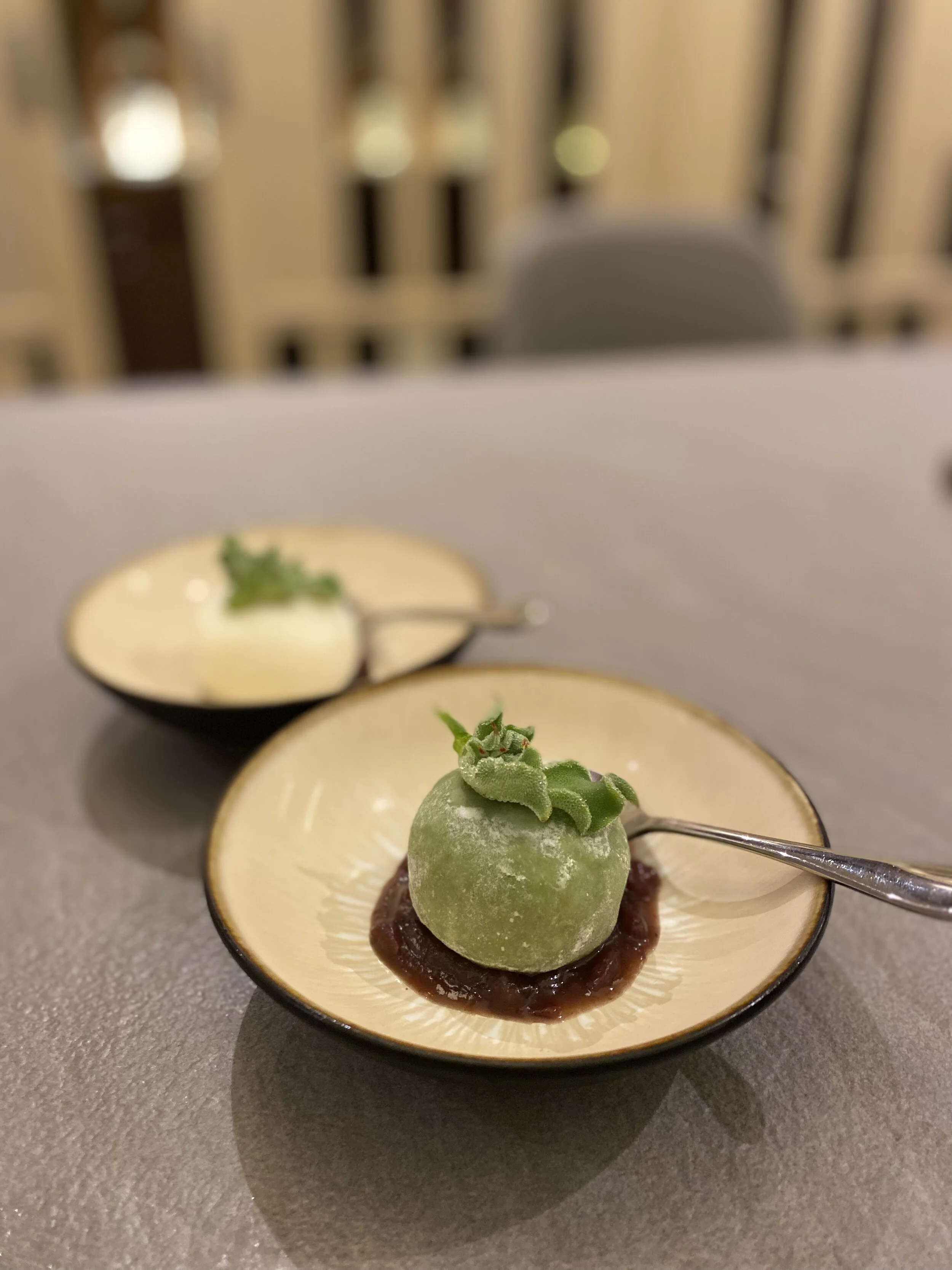 Ending off this lunch course with matcha Daifuku mochi and seasonal durian mochi!