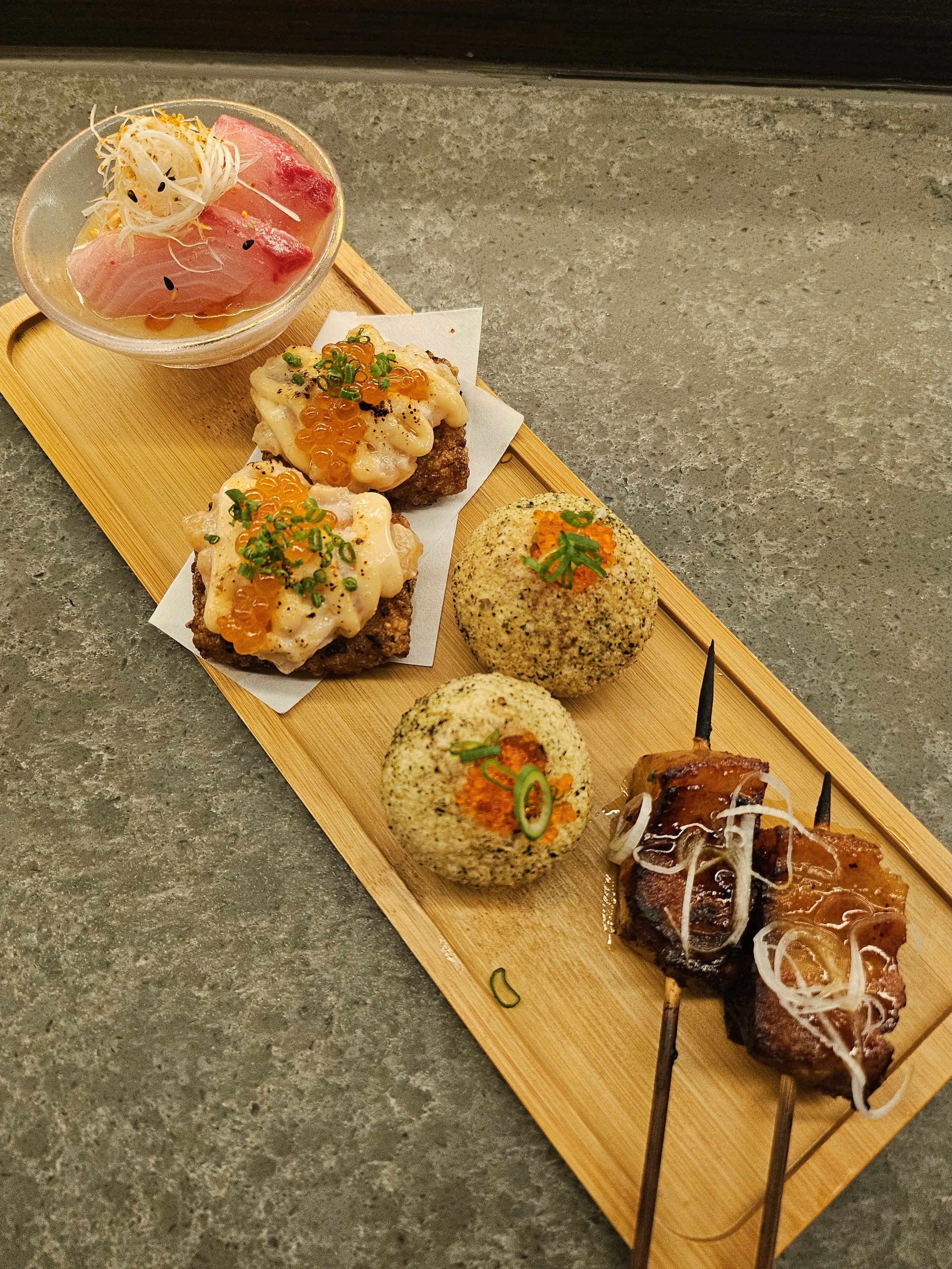 Top left> bottom right: Hamachi Crudo, Aburi Salmon Crispy Sushi, Maguro Poppers, Kakuni Pork Belly
