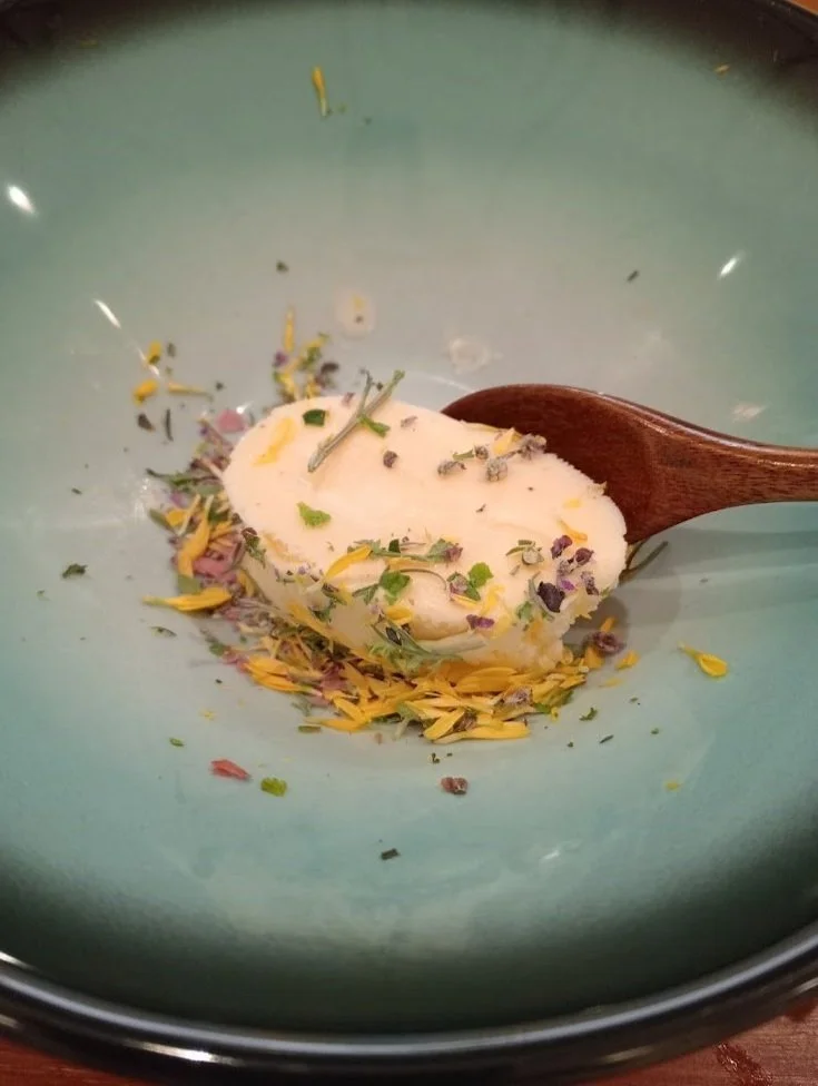 Finish off with this unique dessert that is only available during dinner. It consists of colourful edible flower petals, mint leaves and other fragrant herbs. Liquid nitrogen is then poured, freeze-drying the herbs, creating a frozen texture to the ingredients. Once frozen, the herbs are crushed and a scoop of hokkaido ice cream is added on top. This creates a perfect combination between the ice cream and its frozen floral creation.