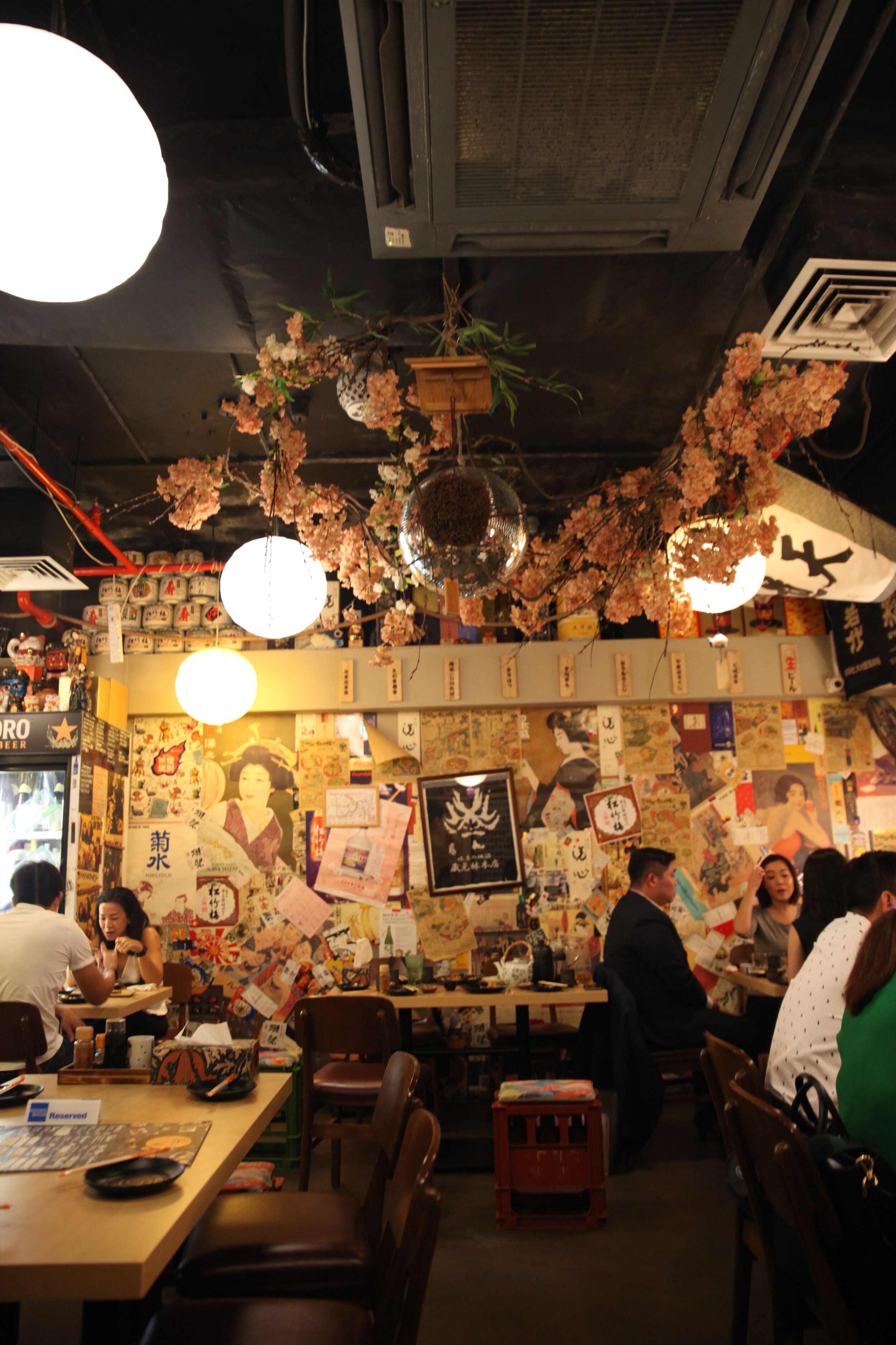 Love the interior and cosy hues which reminds me of Japan, especially with the old advertisement flyers on the wall. Check out that amazing disco ball surrounded by cherry blossoms.