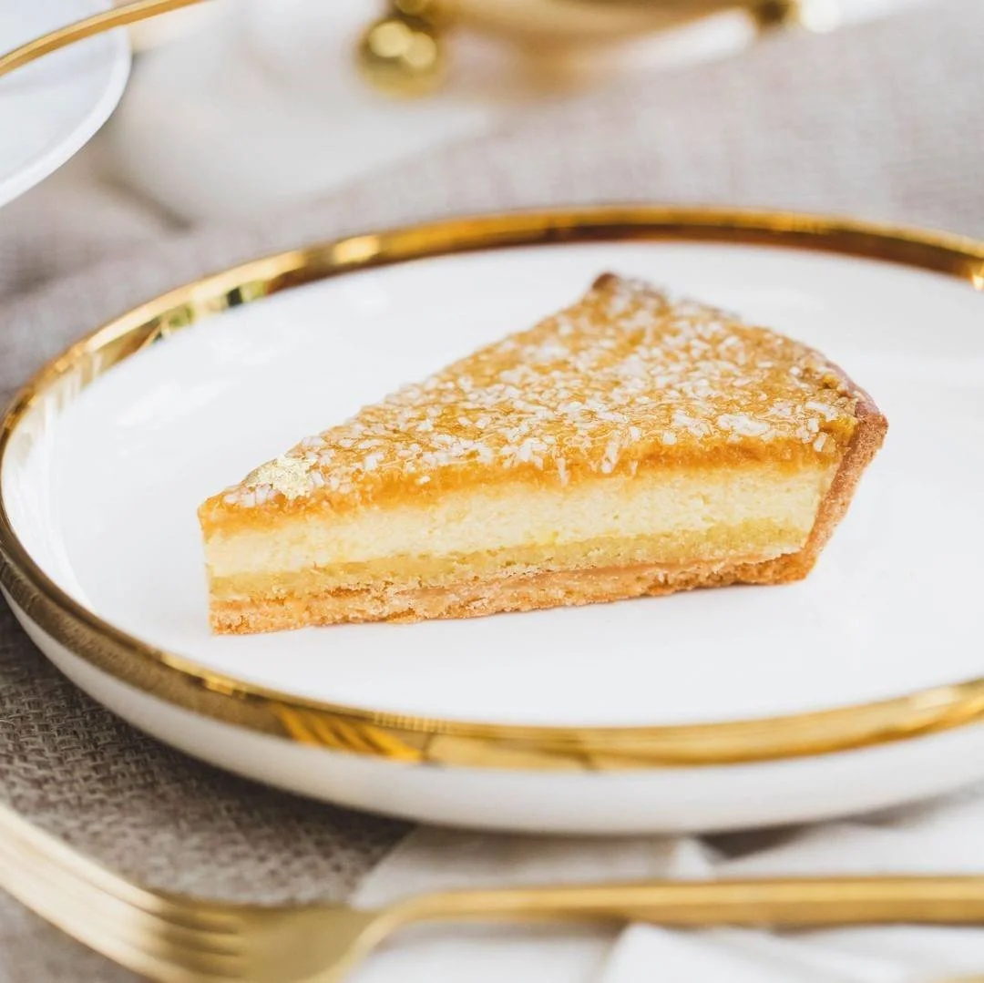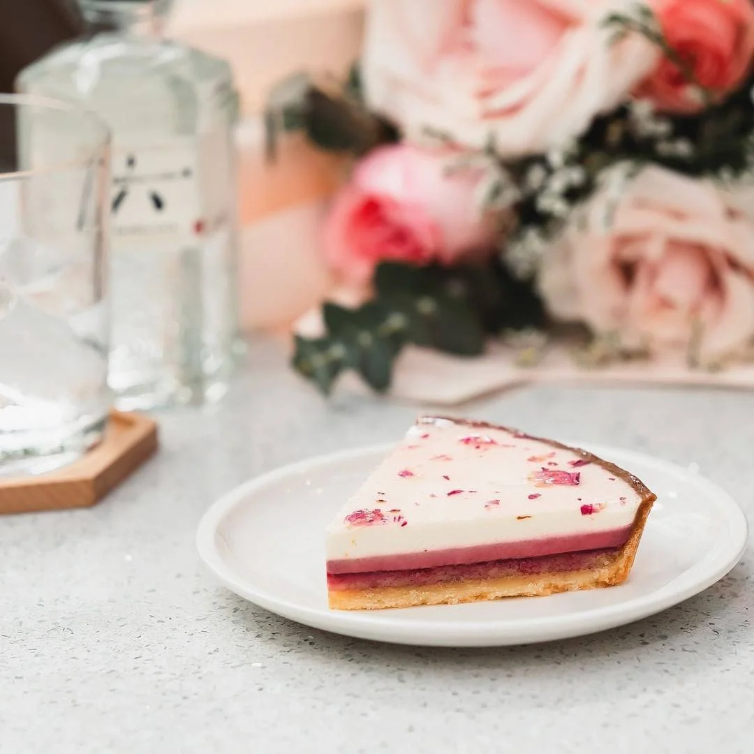 This light and delicate tart is made with creamy Greek yoghurt layered with almond sponge and tangy raspberry marmalade, set upon a buttery almond sable base. It is also topped with sakura glaze and rose petals for a hint of floral notes.