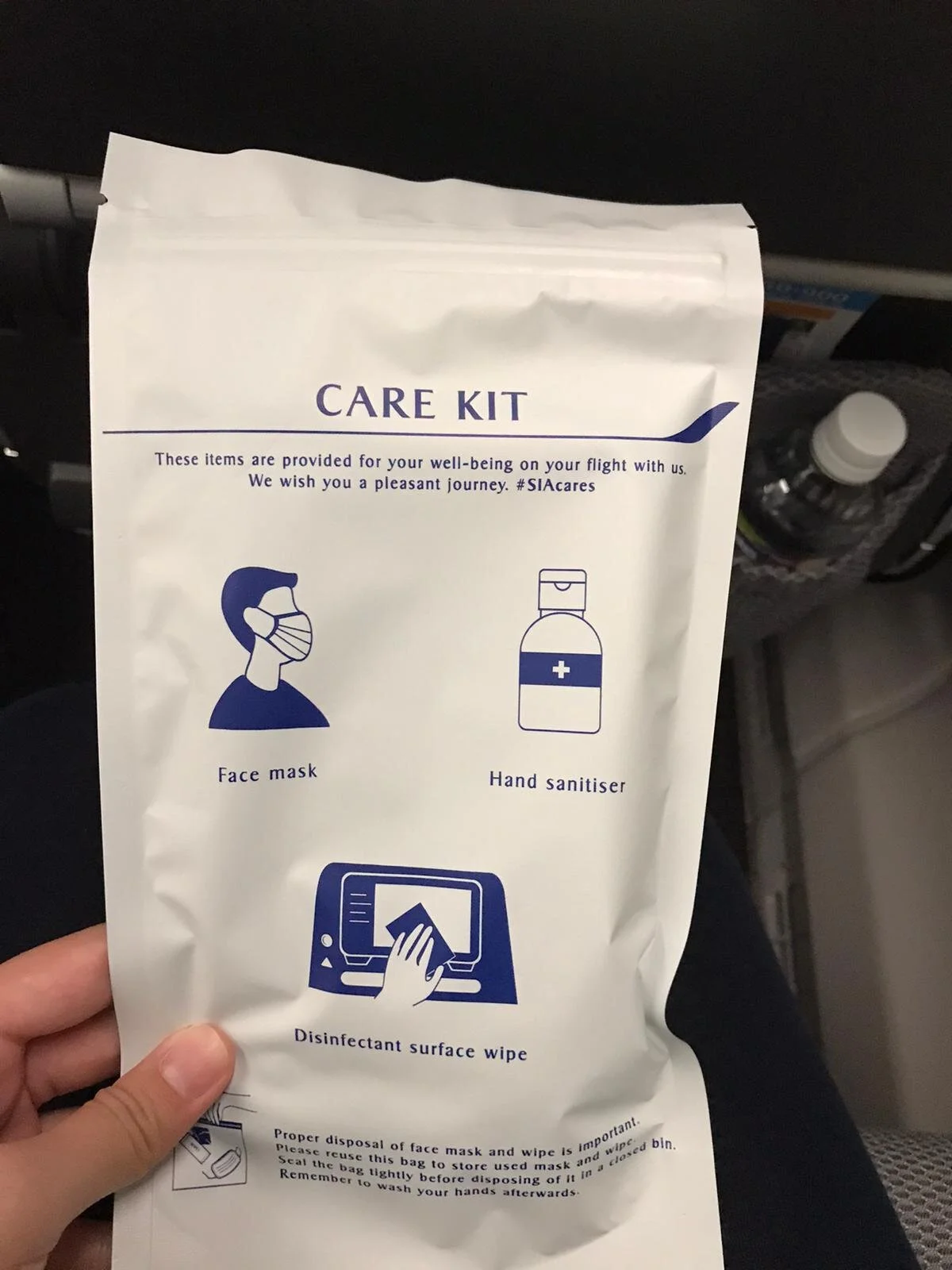We were each given a covid care kit which has a face mask, hand sanitiser and disinfectant surface wipe. Wearing a mask is mandatory throughout the 6 hour flight too!