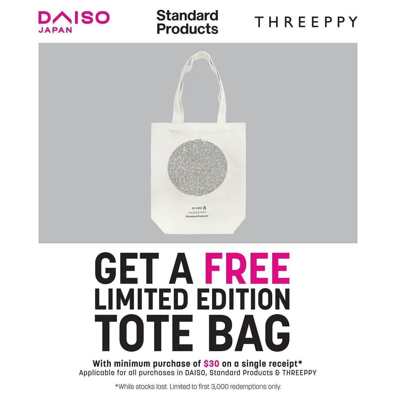 Daiso is having an opening promotion now where you can get a Limited Edition Tote Bag when you spend a minimum of $30 on a single receipt! It includes purchases in Daiso, Standard Products, and THREEPPY. Note that this promotion is available from May 25 to May 27 and is limited to the first 3,000 redemptions only.