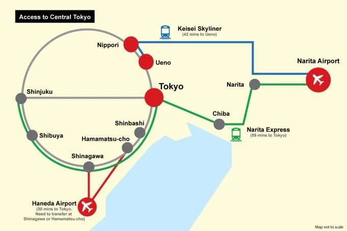 Located in Chiba Prefecture, Narita International Airport is less than an hour’s ride on the Narita Express to central Tokyo. On the other hand, Haneda Airport, which is located in Tokyo, is about a 30-minute train ride to central Tokyo.