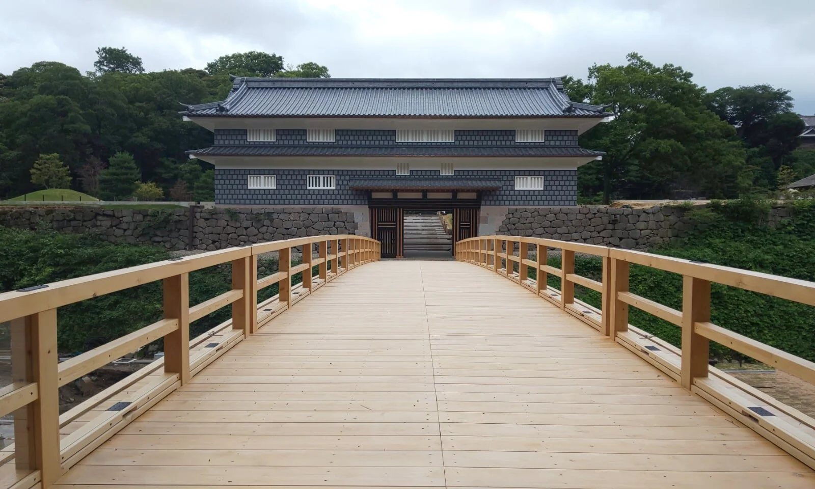 In July 2020, the Nezumitamon Bridge, the largest wooden bridge in Kanazawa Castle, was restored for the first time in about 140 years. Unlike the other gates in the castle, the Nezumitamon Gate features distinctive Namako walls (traditional Japanese tiles used in old samurai residences in the Edo era in Japan) with raised black plaster joining rectangular tiles.