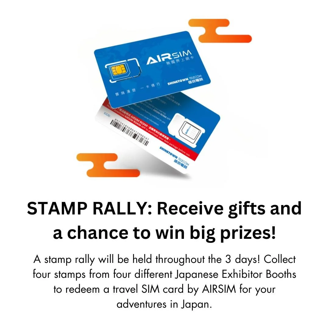 Over the 3 days of the fair, you can collect 4 stamps from 4 different Japanese Exhibitor Booths to redeem a travel SIM card* by AIRSIM for your vacation in Japan.