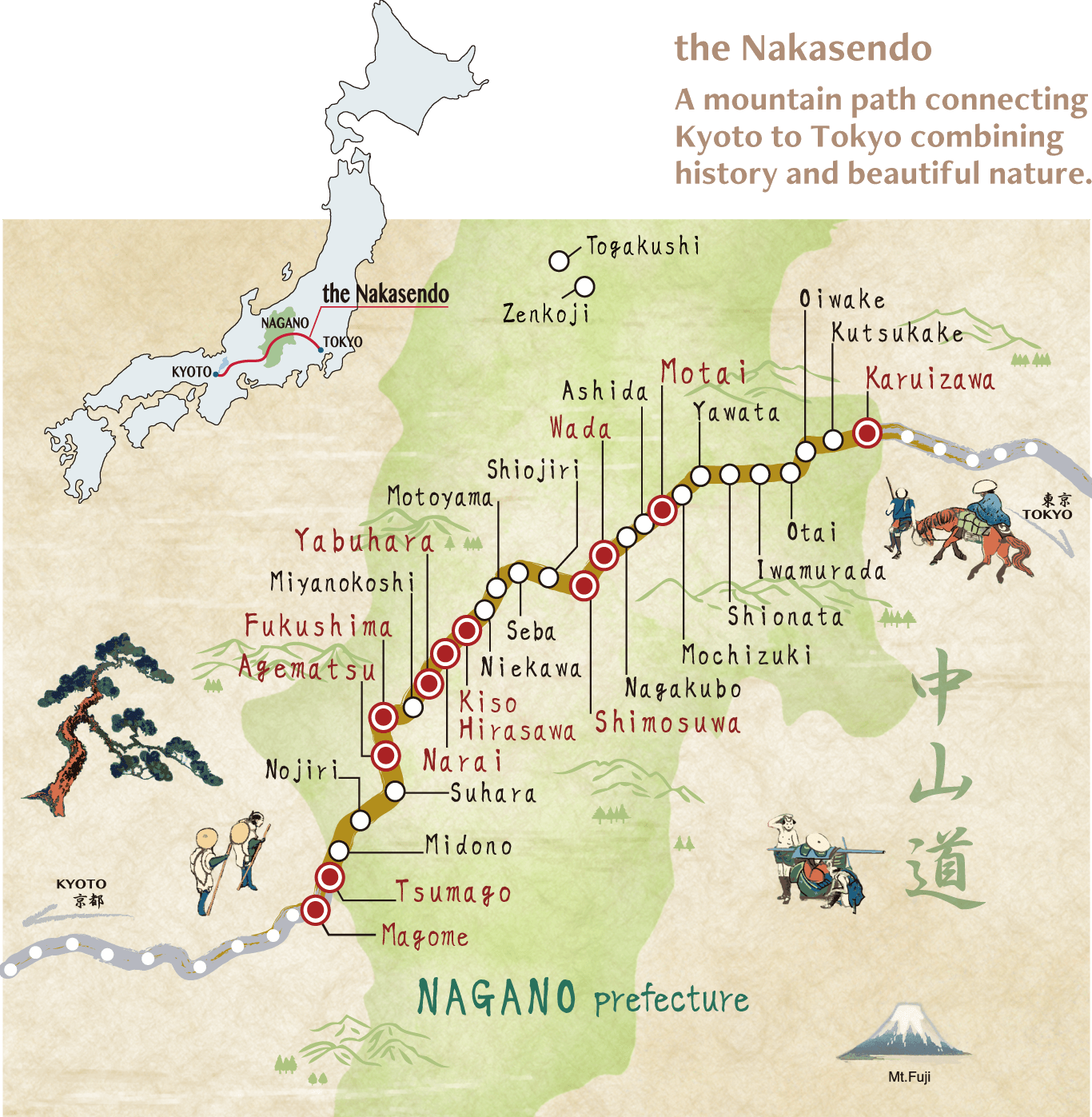 Explore the Nakansendo (“the road through the mountains”)- 533km long historic highway connecting Kyoto (former imperial capital) to the Tokugawa shogunate’s newly installed seat of power in Edo (Tokyo). Some of the best parts of the old road pass through the countryside, and deep into the mountains of Japan’s Central Alps.