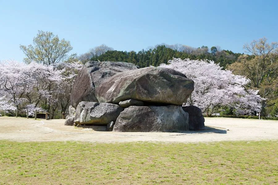 One of Asuka’s highlights is Ishibutai Tumulus, one of Japan’s largest stone burial chambers. During spring, cherry blossoms bloom around the site, adding a seasonal contrast to the massive stone structure.